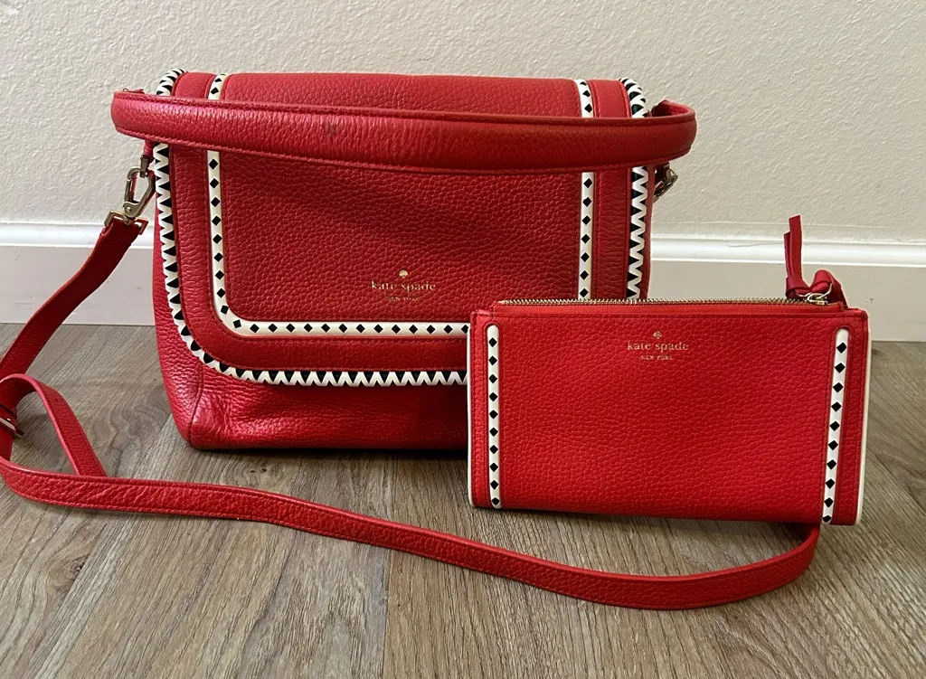 Chic red crossbody bag with matching wallet. Features stylish white accents. Perfect for everyday us... Show more