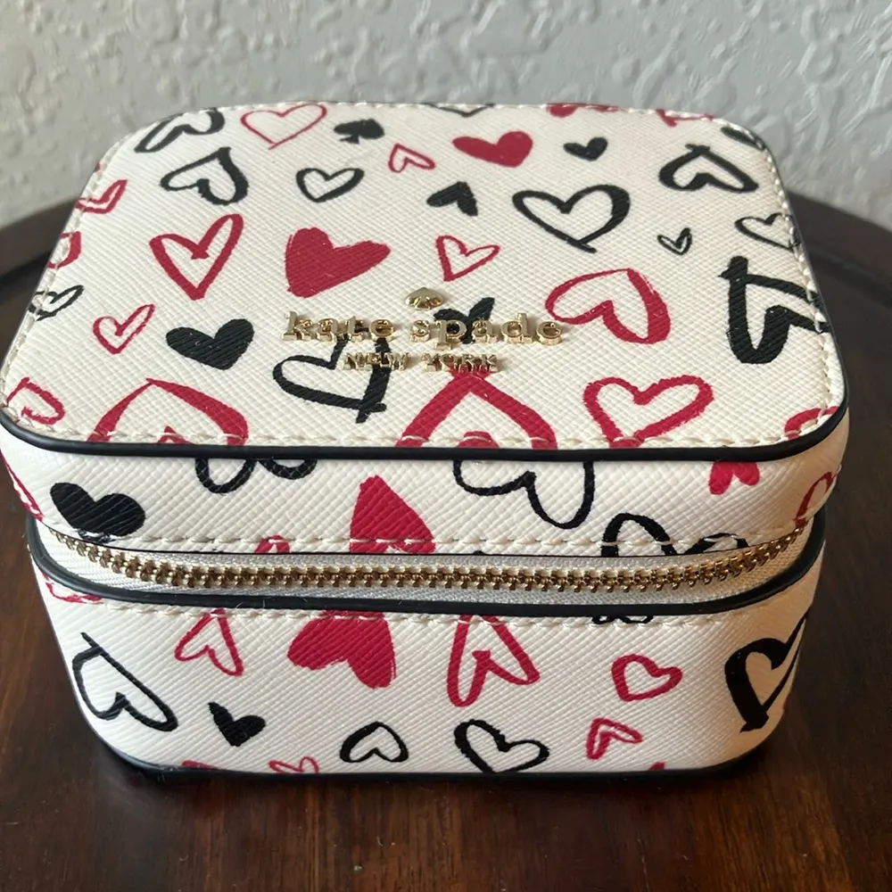 Preowned: Good condition Charming jewelry box with a heart print design. Features a mix of red, bla... Show more