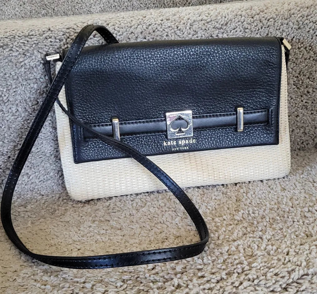 Good Condition Elegant Kate Spade crossbody with a sleek black top and textured tan base. Ideal for... Show more