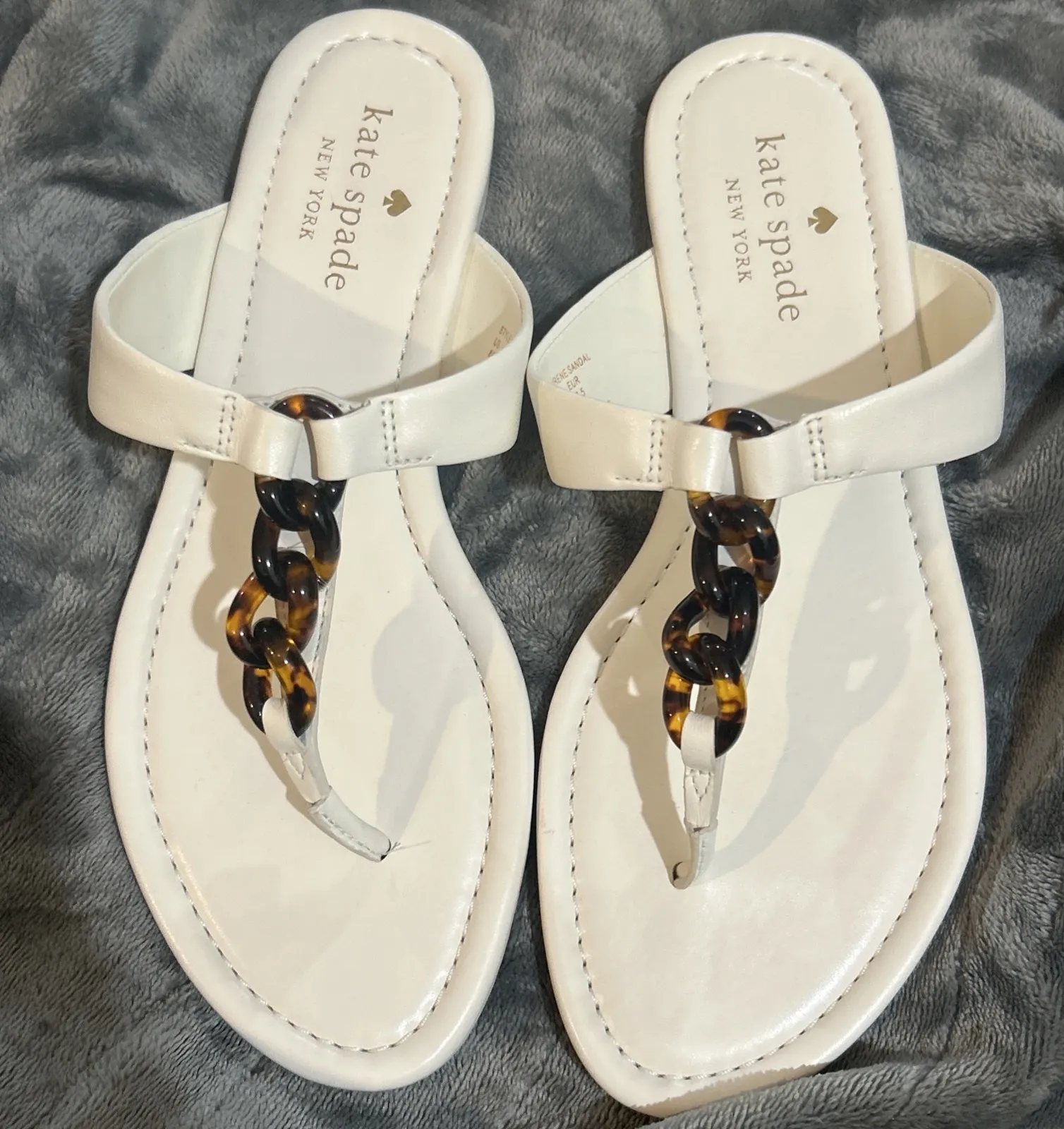 These stylish Kate Spade New York "Irene" sandals feature a chic tortoise-chain detail and a sleek white faux-leather thong design. Perfect for spring and summer — easy to dress up or wear casually. Features: • Style: Irene Sandal • White faux-leather upper • Comfortable slip-on thong style • Tortoise-accent chain detail • Size: US 8B (EU 38.5) • Made in Vietnam • Kate Spade gold-stamped footbed branding