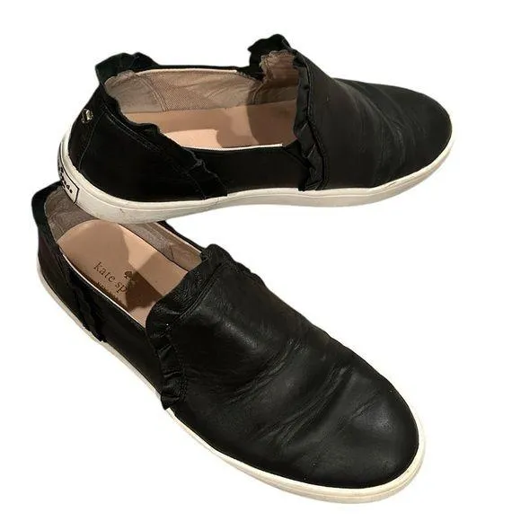 KATE SPADE RUFFLE TRIM LEATHER BLACK WHITE SLIPON RUFFLE PLATFORM SNEAKER SHOE Style is Lilly Elast... Show more