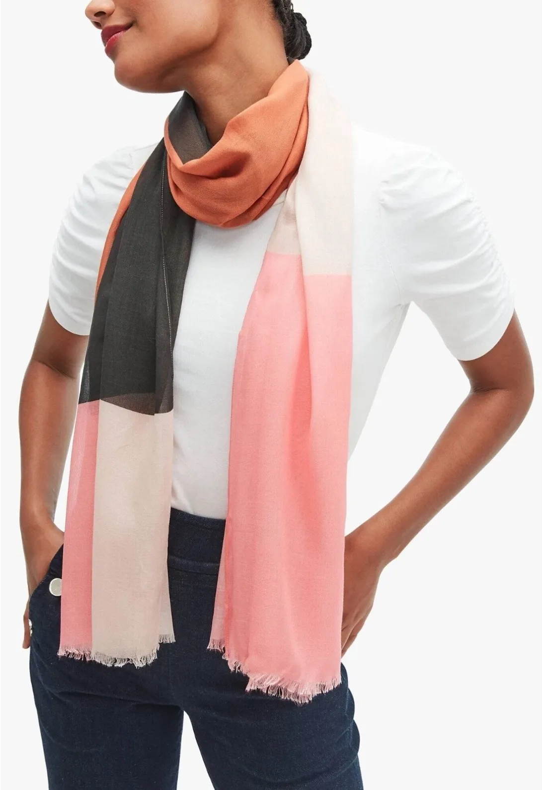 A stylish color block scarf from Kate Spade New York. This accessory showcases a modern geometric design with distinct panels in shades of pink, peach, charcoal gray, and off-white. The edges of the scarf feature a raw fringe detail, adding a touch of texture and casual elegance. The overall aesthetic is chic and versatile, perfect for complementing various outfits. Keywords: colorblock, geometric, fringe, designer, fashion, accessory, neckwear, lightweight, chic, modern, pastel, sophisticated