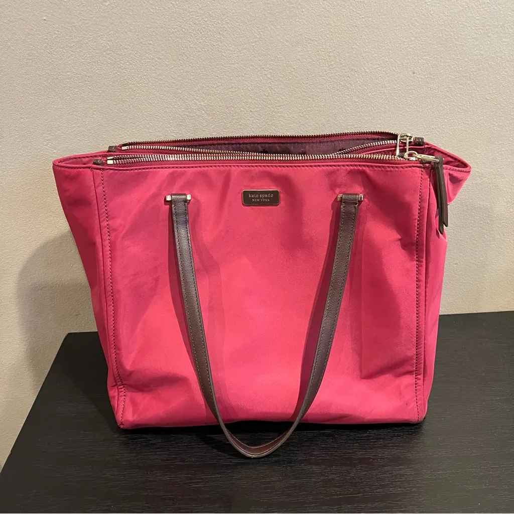 Elegant fuchsia tote by Kate Spade. Features sleek brown straps. Ideal for daily essentials. Kate Sp... Show more