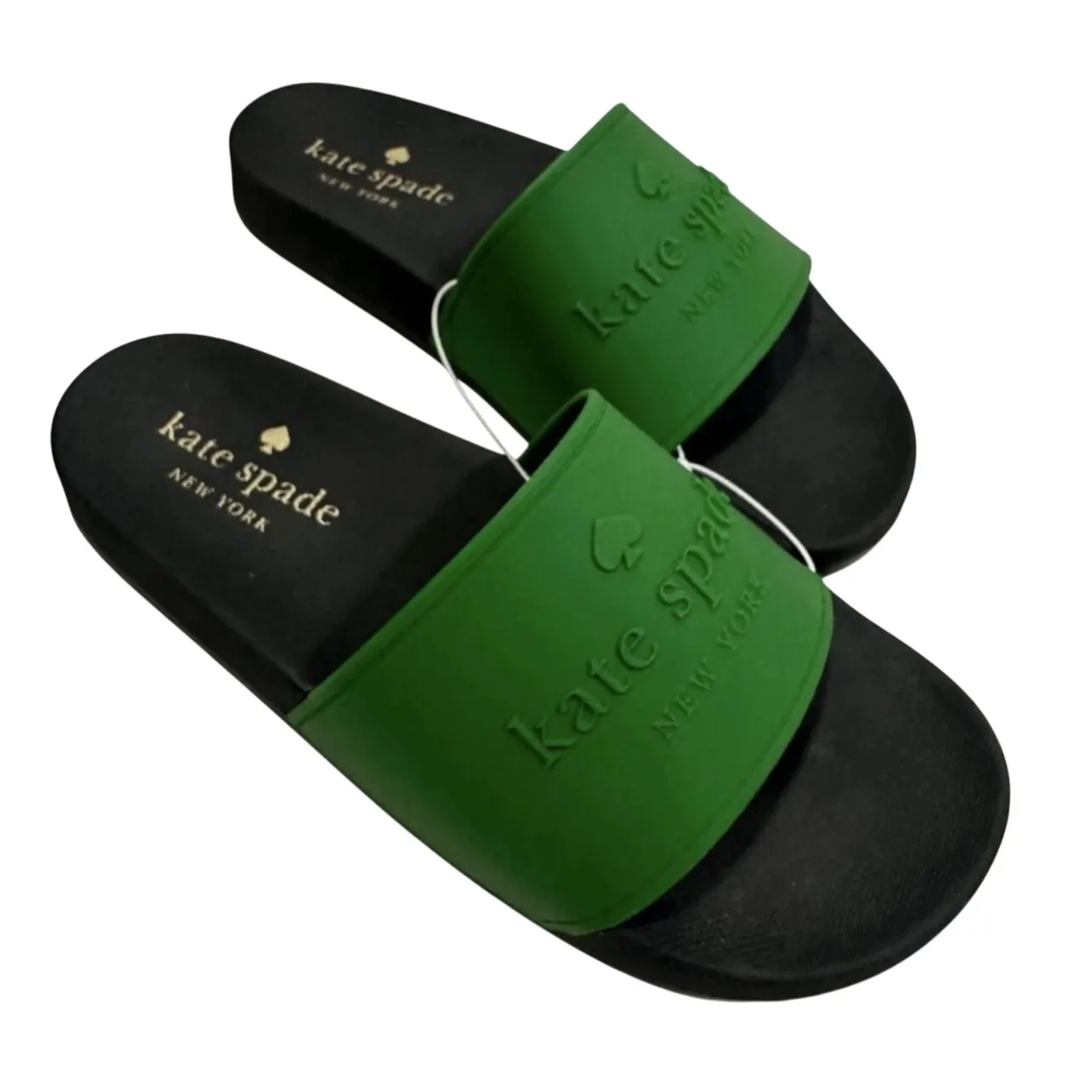 Step into effortless chic with these vibrant Kate Spade New York slide sandals. The bold green strap features embossed logo lettering, a signature touch of playful sophistication that instantly elevates your look. The smooth, molded footbed provides comfortable support for all-day wear, making them perfect for a sunny day at the beach, a casual brunch with friends, or a relaxed stroll through the city. Style: Slide Department: Women Upper Material: Polyurethane Heel Style: Flat Features: Padded, Comfort, Lightweight, Slip Resistant, Non-Slip Closure: Slip On Pattern: Solid Accents: Logo Heel Height: Flat (Under 1 in) Type: Sandal Product Line: Kate Spade Insole Material: Rubber Outsole Material: Rubber Keywords: Kate Spade, slide sandals, slip on shoes, green sandals, logo slides, comfortable, casual wear, summer footwear, designer slides, pool slides, fashion sandals, chic slides