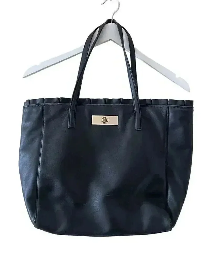 Kate Spade New York Logo Black Leather Tote Double Handles Shoulder Bag Ruffle Trim Hook Closure Siz... Show more