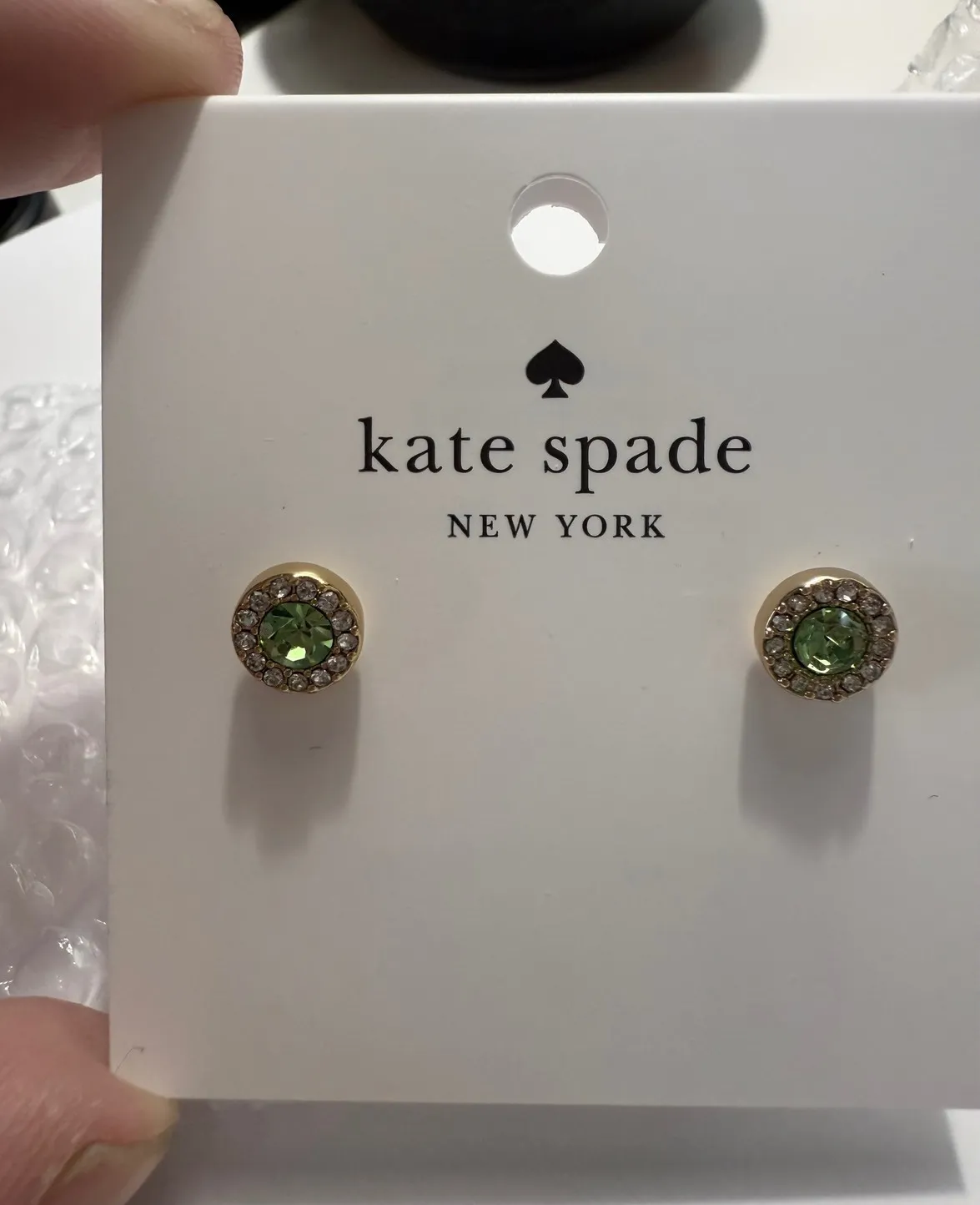 Sparkle with every turn in these charming Kate Spade New York pave halo stud earrings. The vibrant peridot green center stone radiates confidence, beautifully framed by a halo of shimmering stones, creating a captivating sparkle that catches the light. These studs add a touch of refined elegance to any ensemble, perfect for elevating your everyday look or adding a pop of color to a special occasion outfit. Ideal for adding a polished finish to a brunch date or a night out with friends. Style: Stud Main Stone Color: Green Closure: Butterfly Theme: Nature Main Stone: Peridot Metal: Yellow Gold Plated Shape: Round Type: Earrings Main Stone Shape: Round Setting Style: Pavé Ear Area: Lobe Materials sourced from: China Secondary Stone: Peridot Era: Undated Keywords: Kate Spade, studs, green, gold tone, halo, pave, delicate, everyday, gift, statement, feminine, chic, fashion