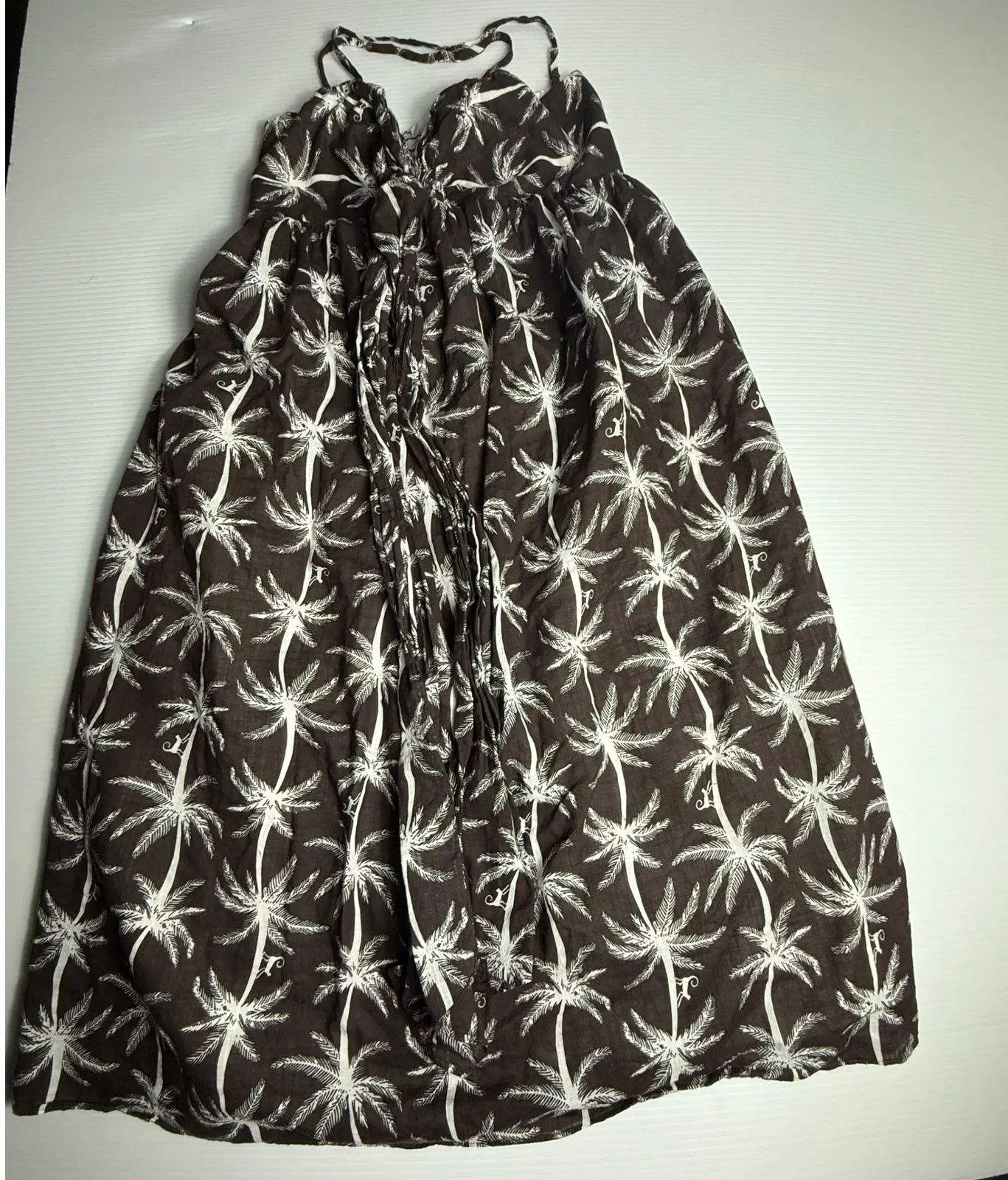 Keywords: Kate Spade dress, sundress, palm tree print, brown dress, cotton dress, smocked dress, summer dress, vacation dress, resort wear, adjustable straps, lined dress, casual dress, medium dress