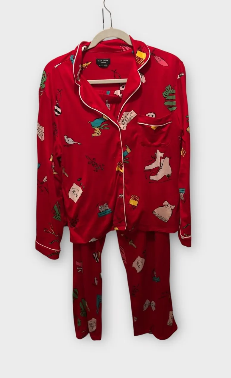 Type: Pajama Set Department: Women Color: Red Style: Pattern: Graphic Print Material: Polyester, Spandex Fabric Type: Knit Sleeve Length: Long Sleeve Season: Fall, Winter, Spring, Summer Closure: Button Accents: Button Keywords: Kate Spade Pajamas, Womens Pajama Set, Red Pajamas, Novelty Print Pajamas, Size Medium Pajamas, Sleepwear Set, Pajama Top and Bottom, Kate Spade Sleep Set, Polyester Pajamas, Loungewear Set, Womens Loungewear, Cute Pajamas, Gift for Her