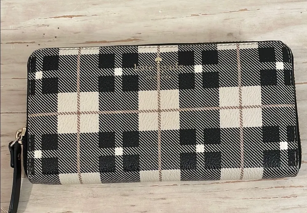Fabulous checkered plaid neutral color coated canvas long wallet. Zip around style. Gold hardware. O... Show more