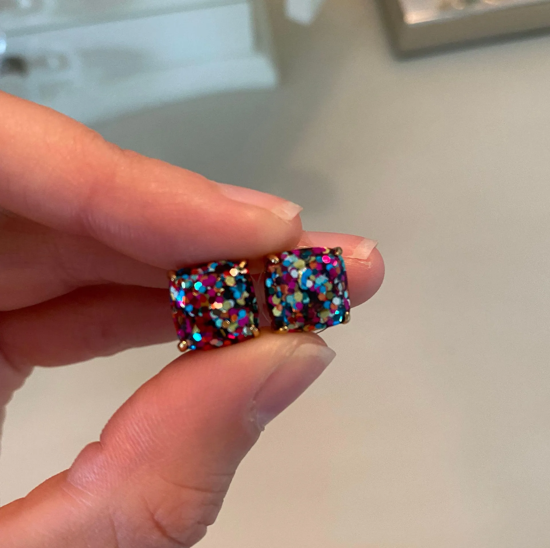 • square gold earrings with rainbow sparkle confetti pieces inside