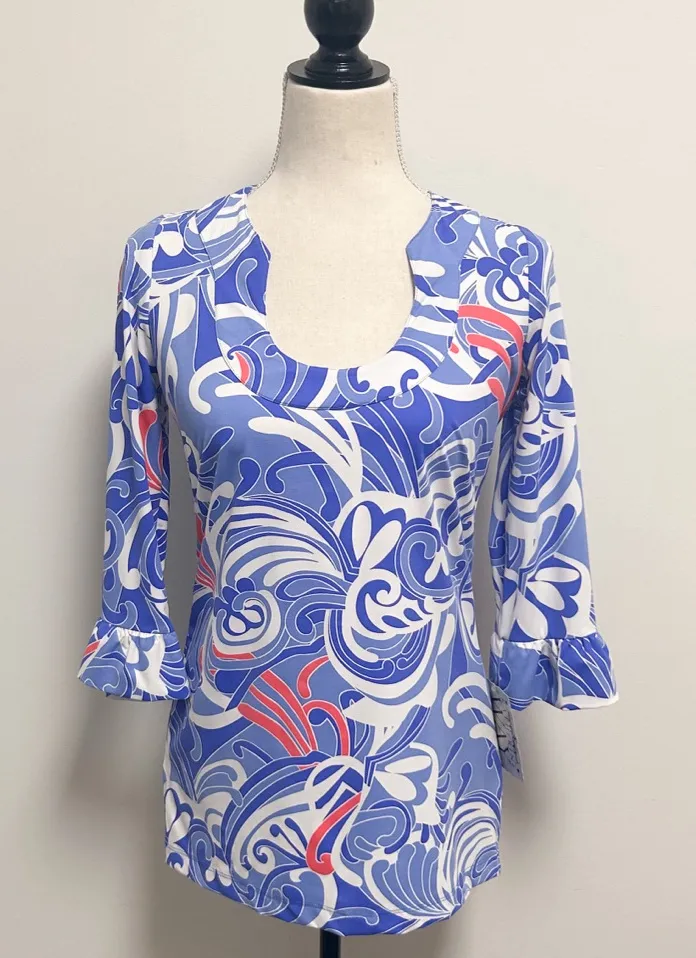 Brand: Katherine Way Size: XS (please see measurements below) Style: Multicolored swirl print pullover top. “U” neckline. 3/4 length circular flounce sleeves. Bottom side vents. Darts on chest. Material offers stretch. Please note that the interior material/care tag has been removed but it is 82% nylon, 18% spandex and machine washable. Condition: New with tag but please note that the interior material/care tag has been removed. Approximate measurements when laid flat: 17” bust, 15.75” waist, 17.25” sleeve and 26” length from top of shoulder to bottom hem. Please feel free to reach out with any questions prior to purchase. Comes from a smoke free home. I typically ship within 24 hours but please be advised that I do not ship on Saturdays, Sundays or holidays. Thank you for understanding!