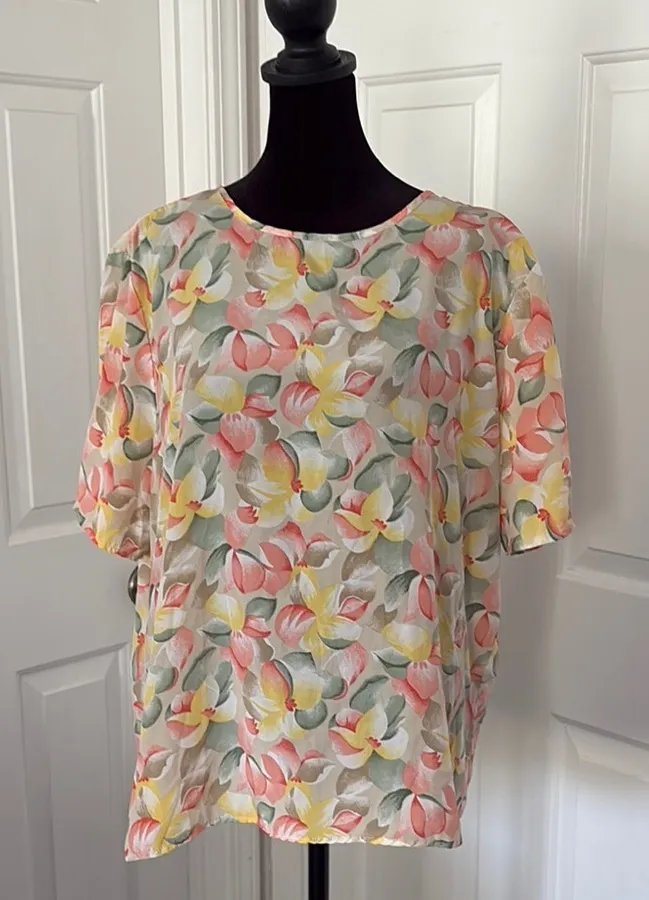 Kathie Lee’s 90s Pastel Blouse is a stylish choice for a casual, warm-weather ensemble. This blouse from the Kathie Lee Collection features a relaxed, boxy fit with short sleeves and a rounded neckline. It has a keyhole button in the back. The top is adorned with a vibrant mix of yellow, coral, and green tones. The blouse would fit a large best, but please see the photos for accurate measurements. The material tag is no longer attached. Style this blouse with trousers for work or wear it with denim for a more casual look!