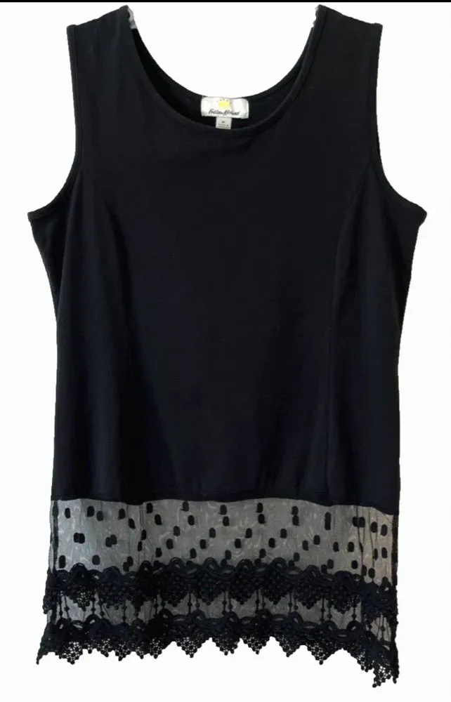 This elegant black sleeveless top features a delicate lace detail at the hem, perfect for adding a touch of sophistication to any outfit. Ideal for both casual and formal occasions. Kathleen Kirkwood layering tank top. * Brand: Kathleen Kirkwood * Product Type: It is described as a layering tank with a lace or velvet extender hem. * Purpose: These tops are designed to be worn under sweaters or jackets to add length and a decorative lace detail.
