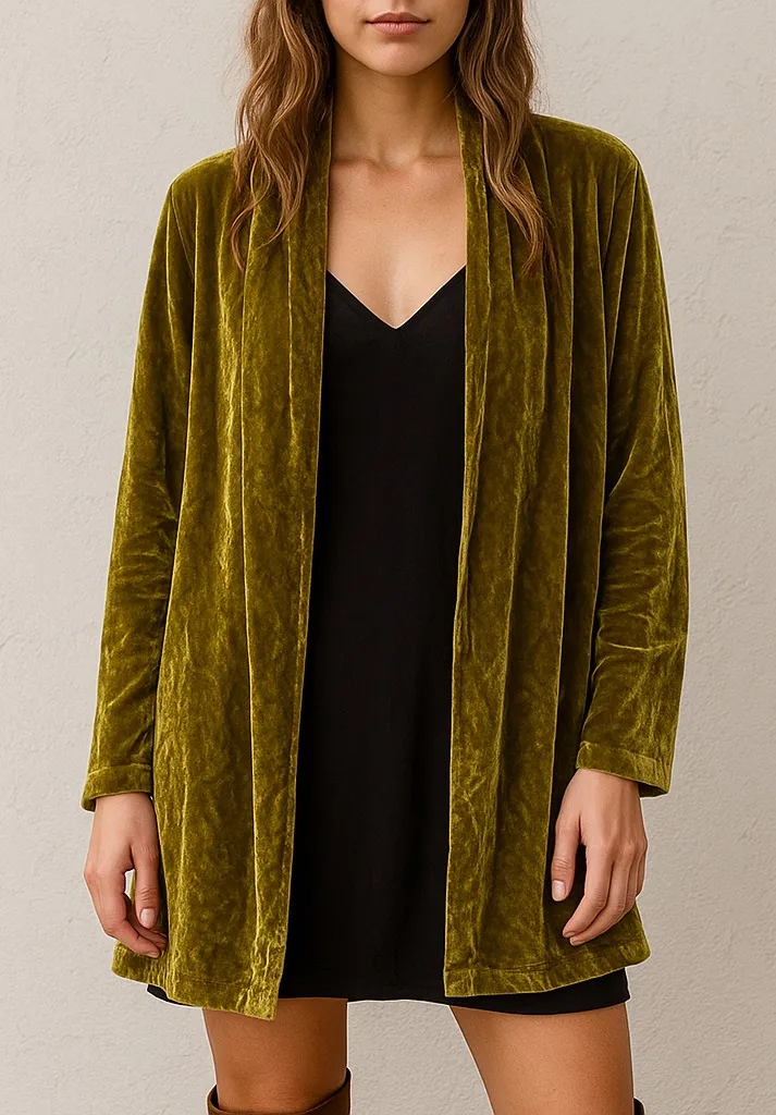 Elevated vintage-inspired silk velvet cardigan jacket by Kathleen Sommers in a rich dijon/chartreuse hue. This open-front layering piece drapes effortlessly with a luxe, fluid silhouette—perfect for adding quiet drama to everyday looks or evening ensembles. Condition: EXCELLENT Fabric: 18% silk / 82% rayon silk velvet blend Color: Dijon (chartreuse green) Made in USA – boutique designer brand Size: Medium Measurements (approx, laying flat): • Bust: 22.75” • Sleeve: 23.5” • Length (shoulder to hem): 34.5” • Sweep: 33.75” Layer over slip dresses, slim trousers, or denim for a modern take on Quiet Luxury or Bohemian elegance. #QuietLuxury #SilkVelvet #DesignerCardigan #LuxeLayers #BohemianStyle #VintageInspired #MadeInUSA #Chartreuse #VelvetTrend #TimelessStyle Fast shipping | Smoke-free home Measurements approx. fit may vary. AI image mockup for style purposes only. Colors may differ slightly on screen. Clean & sanitized | Offers welcome!
