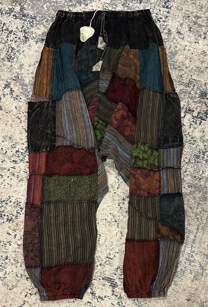 Never worn! Explore vibrant style with these multicolor patchwork pull on pants. Perfect for a bold, unique look. Features elastic waist and draw string with side pockets. Fits small/medium best