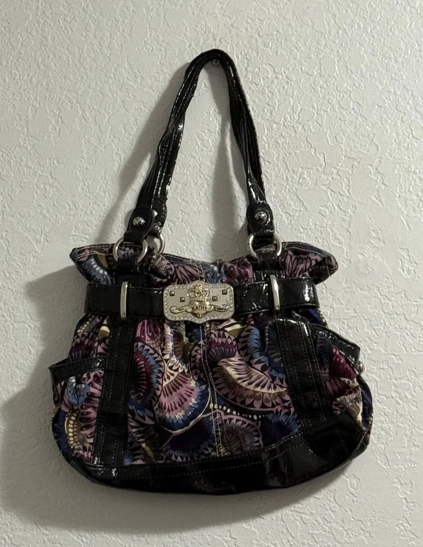 Please see photos as has wear on the handles ✨ Details: • Brand: Kathy Van Zeeland • Color: Purple, blue, pink, and olive floral pattern with silver metallic trim • Material: 100% polyester body, 100% vinyl trim, 100% polyester lining • Interior: Fully lined with logo print, zip pocket, and open slip pockets • Exterior: Two side pockets, rhinestone crown buckle detail, metal logo charm Approx. size: 13” W × 10” H × 5” D • Strap drop: ~9”