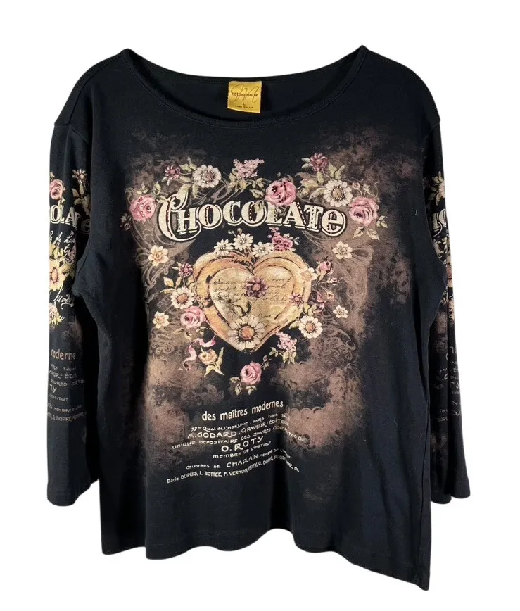 Measurements: • Pit to pit: 21 inches Type: T-Shirt Department: Women Style: Basic Material: Cotton Neckline: Round Neck Sleeve Length: 3/4 Sleeve Sleeve Type: Casual Sleeve Accents: Rhinestone Pattern: Floral Features: Preshrunk Fit: Regular Keywords: Katina Marie, Floral top, Chocolate print, Rhinestone top, Long sleeve top, Womens top, Graphic tee, Vintage style, Made in USA, Crew neck, Casual top, Comfortable, Everyday wear Ships fast from a smoke and pet free home.