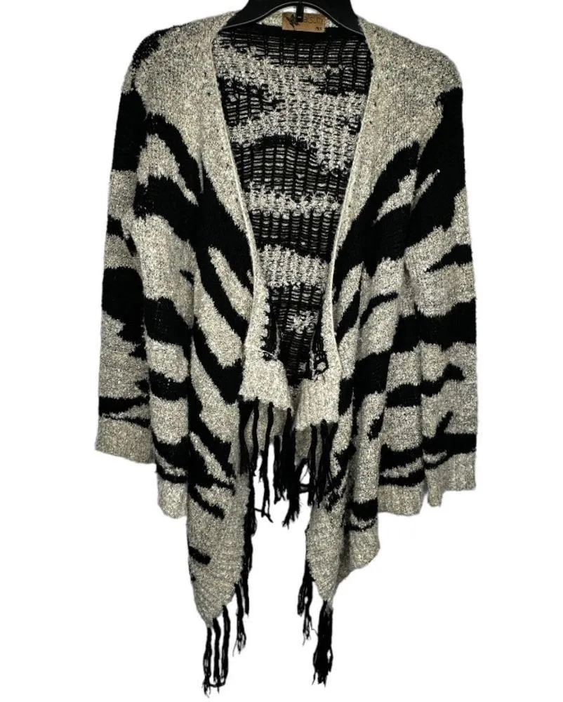 The Katsumi Acrylic Animal Print Cardigan Sweater with Fringe is a stylish piece for any wardrobe.... Show more