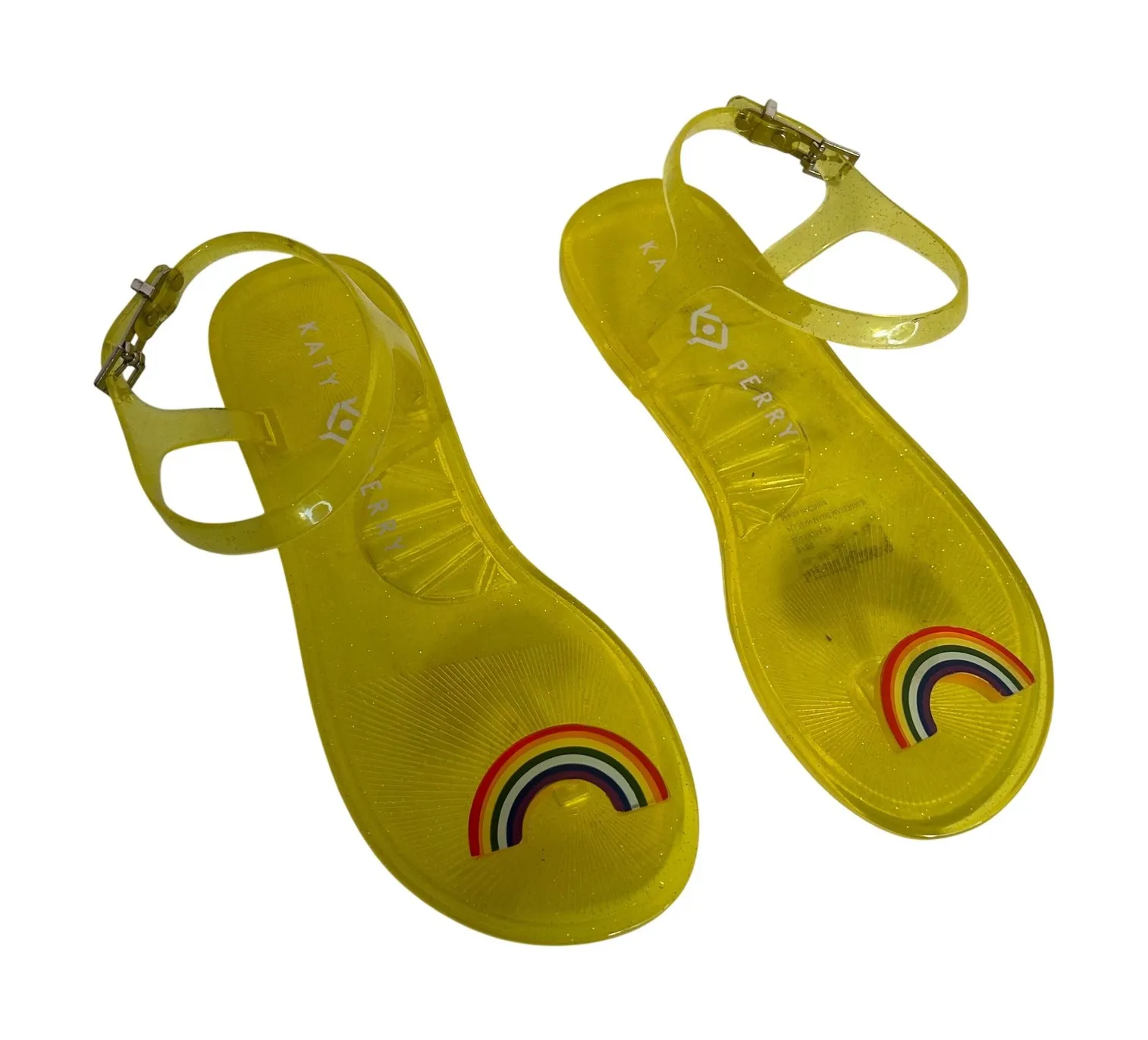 Katy Perry The Geli jelly sandals in a bright yellow hue. These clear plastic sandals feature a glitter accent throughout and a charming rainbow detail on the toe strap. Adjustable buckle closure at the ankle strap ensures a secure fit. The footbed displays the Katy Perry logo. Excellent condition Style: Flat Department: Women Upper Material: Plastic UK Shoe Size: 3 AU Shoe Size: 4 Heel Style: Flat EU Shoe Size: 35 Features: Ankle Strap, Straps, Buckle, Adjustable Strap Closure: Buckle Pattern: Solid Accents: Glitter, Logo Heel Height: Flat (Under 1 in) Type: Sandal Keywords: Katy Perry shoes, jelly, rainbow, clear, glitter, summer, beach, pool, vacation, cute, fun, festival, comfortable, bright Fast shipper- most item ship within 1 day!