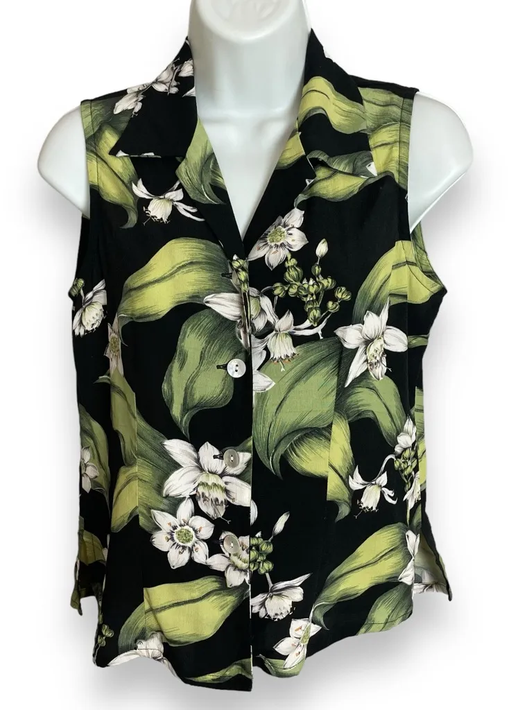 Kaua'iana Hawaiian button-up sleeveless rayon blouse with white flowers. Collared neckline. Condit... Show more