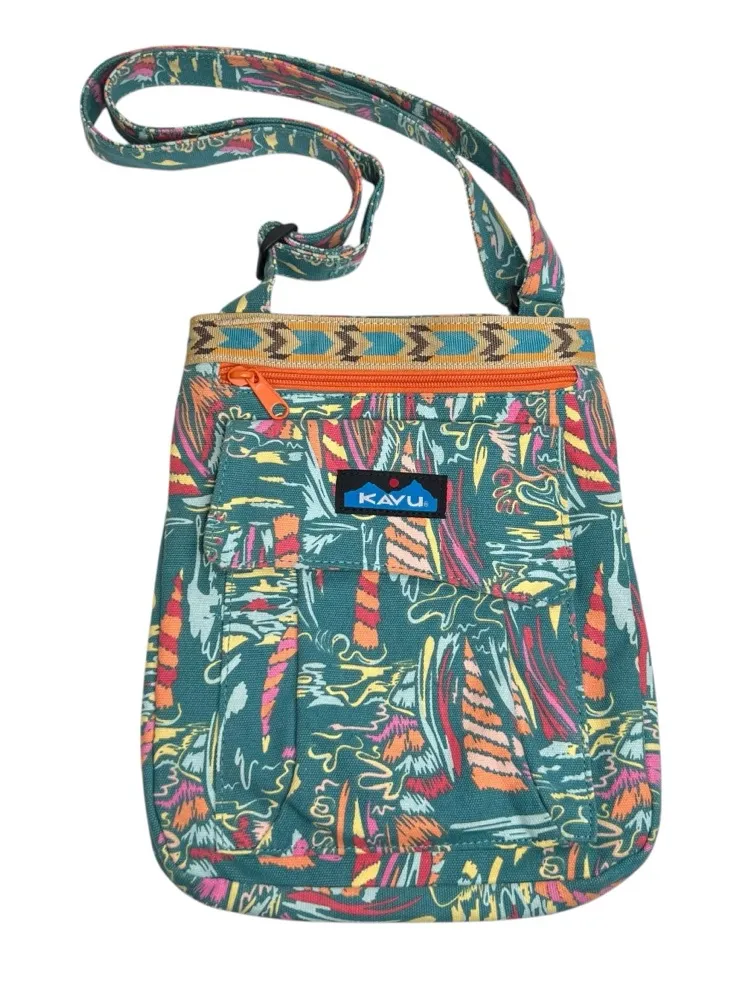 . In great preowned condition: a few very small marks to the outside (see circled pics) but very clean on the inside. Adjustable crossbody strap. Sturdy cotton canvas in a teal green, orange, pink and yellow with an abstract print of sailboats. Plastic hardware. Main compartment with magnetic snap closure, pattern webbing detail, front zip and patch pockets with internal plastic key clip, back flat pocket. Measures 10.5 x 9 x 1.25” Strap drop measures 11-21.5”