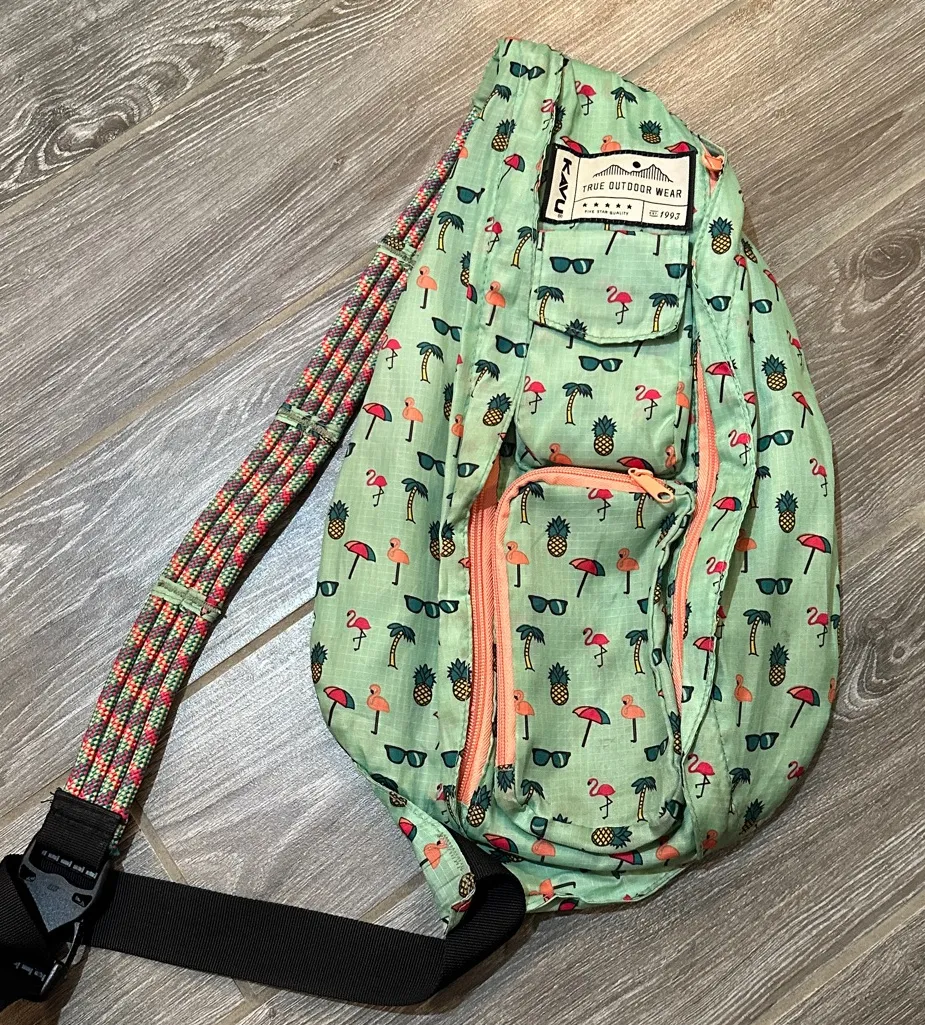 In good used condition with some small and minor wear/marks. No stains inside. Please refer to pics for specific condition of bag 100% Polyester Imported Lightweight sling pack with adjustable rope shoulder strap Two vertical zip compartments, two key or cell phone pockets Padded back with KAVU embroidery DIMENSIONS: 1 in 4 in 4 in