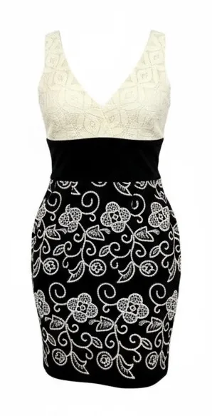 Kay Unger Embroidered Lace Linen Blend Dress Black Cream Belted Sleeveless Cocktail Size 2 Step out... Show more