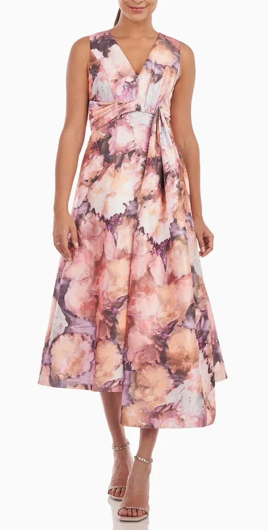 Kay Unger Lani Abstract Floral Print metallic Organza Formal Midi Dress Size 0 Excellent, new without tags condition! MSRP: $298 Abstract Floral Print on metallic organza, sleeveless, v neckline, pleating detail on bodice with draped sash, empire waist midi dress with pockets. Zipper closure Sleeveless V-neck Asymmetric hem Pockets No stretch Length: 30" from waist to hem 100% Polyester Lined Dry clean only prom, homecoming, pageant, gala, formal wear, wedding, wedding, guest, military ball, mother of the bride, mother of the groom, black tie, party, Christmas, thanksgiving, cocktail, special occasion, special event, Vegas, bridal shower, rehearsal dinner, cruise, vacation, bridesmaid, red carpet, bridesmaid