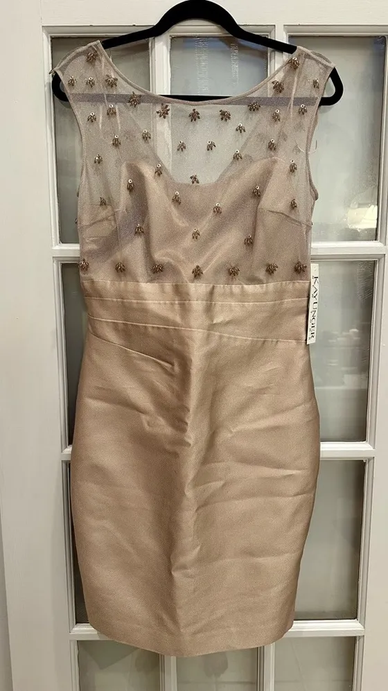 This chic sleeveless beige dress is adorned with delicate embellishments, offering a stylish and sophisticated look for any occasion. New with tags, no flaws Absolutely gorgeous champagne color Lined, zipper back Smoke free home