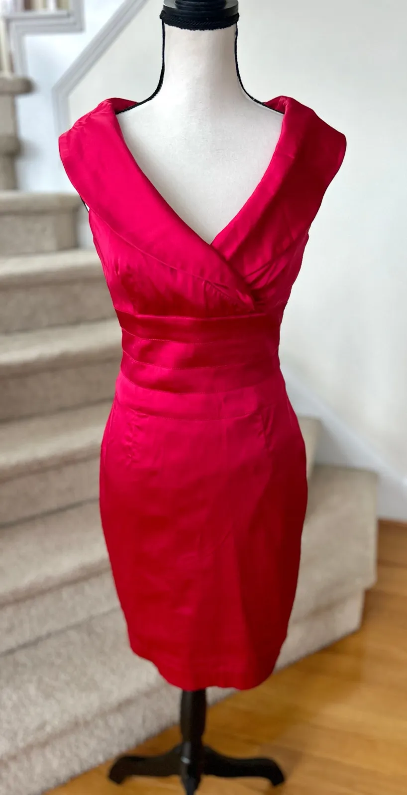 Excellent condition. Red with pink undertones, shawl collar v-neck, sleeveless, knee length shift. Back zipper. Size 4 pit to pit 15.5 inches shoulder to hem 37 inches waist flat 13.5 inches hips flat 16.5 inches acetate/nylon/spandex holiday, party, christmas, mother of bride