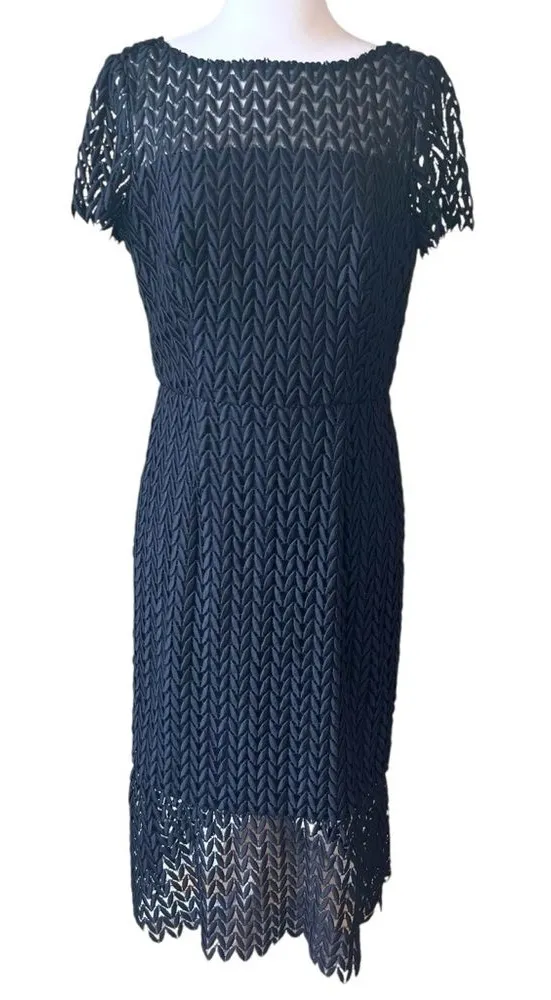 Excellent pre owned condition Bateau neckline, back v-neck Concealed back zip Short sleeves Tonal lace petals Partially lined Flounce hem Midi length Size 10 See photos for approximate measurements