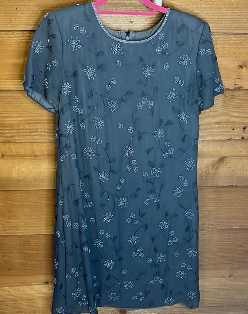 Stunning vintage Beaded 100% Silk Dress. Lined. Full zip back. FLAWLESS. Beaded neck and floral design. Size 8 / p2p 19” / length from shoulder to hem 35.5” Tags: beaded beads holiday party new years Christmas New York bridal bride silk floral dress 90s vintage prairie