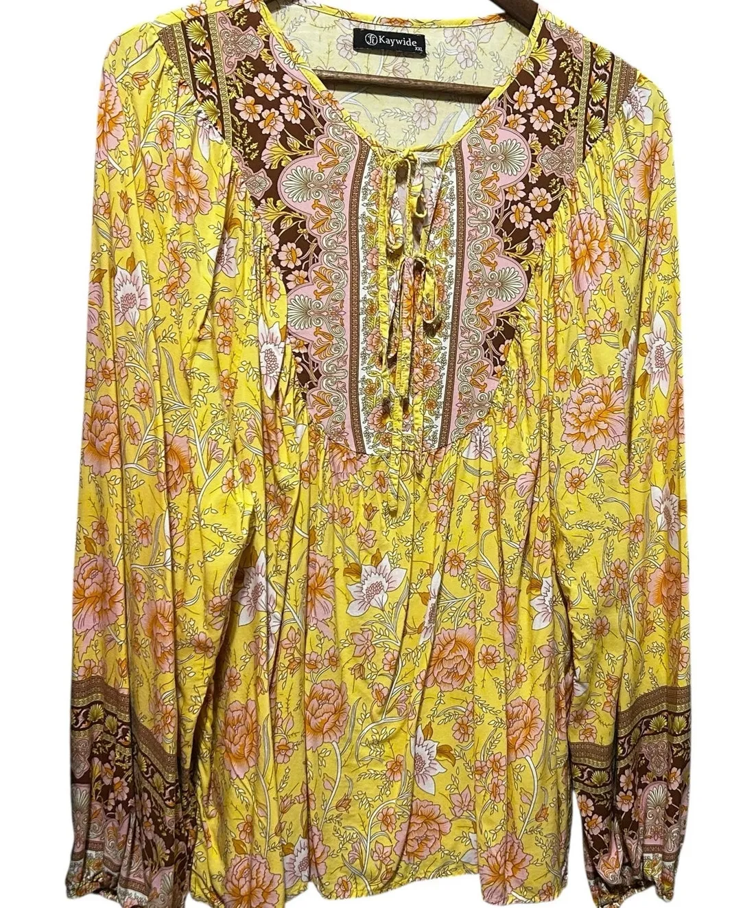 Kaywide Women Boho Floral Babydoll Tunic Top XXL Cottagecore Festival Hippie Great Pre-Owned Condition - See Pictures for Details Details: (First picture truest color) -flowy hem -front tie keyhole -soft yellow background with pink and peach flowers -paisley and floral pleated gathered bib neckline -lightweight -long ballooon sleeve with elastic cuff -relaxed babydoll silhouette -viscose spandex blend, machine wash Style Profile: comfortable, easy care, packable, feminine, versatile, stylish, work, office, weekend, vacation, travel, blouse, peasant, vintage inspired look, 70s vibe Approximate Measurements: flat lay: armpit to armpit: 25“ length: 27“ Pet/ smoke free home 1-2 day shipping Bundle & Save