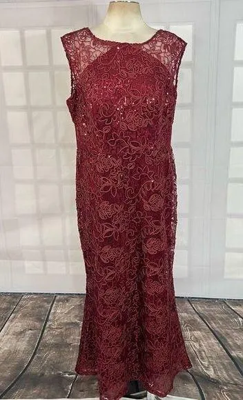 Slny sleeveless maroon red embroidered sequined lace gown size 16 Fun flirty and feminine chic classic timeless elegant sleeveless maroon lace gown with sequin detailing. Sheer back and shoulders Excellent used condition Great for a guest of wedding or holiday party
