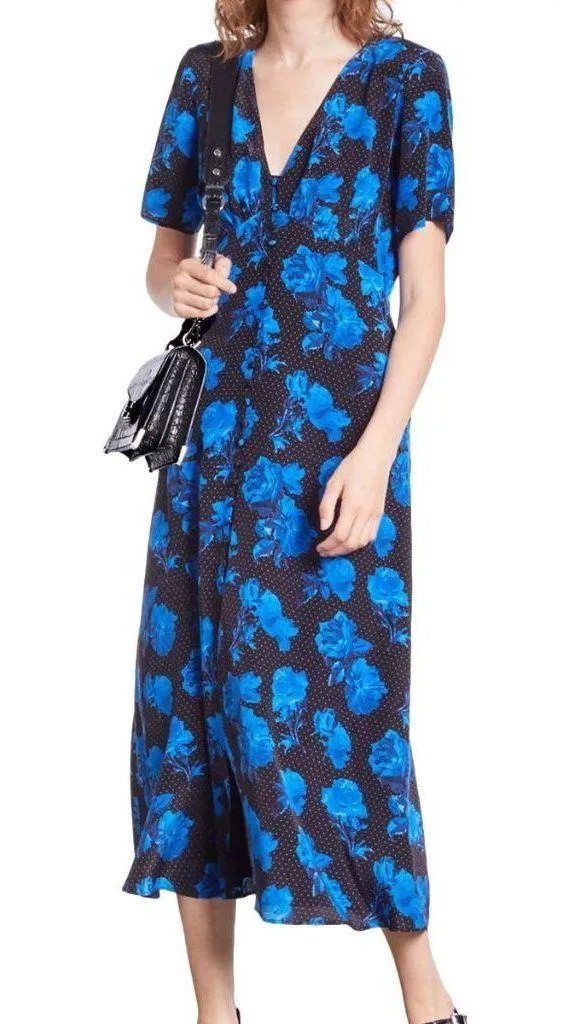 V-neck Short sleeves Fabric covered front button closures Printed Lined VIntage 40's Style Retro inspired floral and pin dot print The Kooples Size French 0 / US XS or 2- see brand size chart in photos for measurements NWT $575 retail! #silk #retro #thekooples #floral #pindots #mididress #vintage #quietluxury