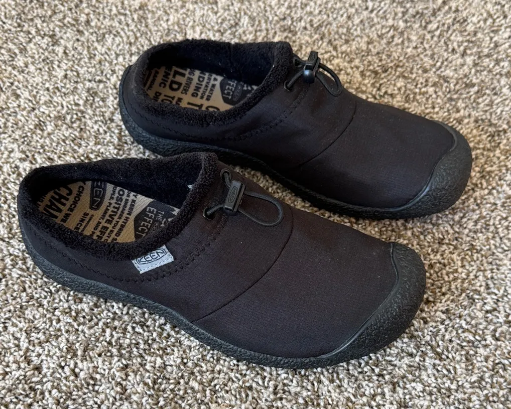 Sleek black slip-ons by Keen. Easy to wear. Ideal for everyday comfort. Size 7 Versatile slipper for weekend lounging and campfire building Weather-resistant upper fends off light precipitation Slip-on design for easy on-off Fleece lining boosts warmth Removable insole offers added comfort and odor resistance Non-marking rubber sole delivers reliable traction