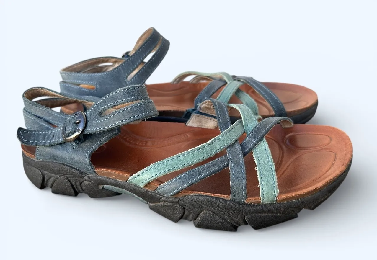 Comfort-focused KEEN Naples II sport sandals featuring soft leather straps in a blue and teal colorway with KEEN’s supportive contoured footbed. Designed for walking, travel, and everyday wear, these sandals offer excellent comfort with a secure adjustable fit. Details: • Brand: KEEN • Style: Naples II • Color: Blue / Teal • Women’s Size: US 9.5 • EU Size: 40 • Footbed length: approx. 26 cm (per tag) • Upper: Leather • Footbed: Cushioned, contoured • Sole: Rubber traction outsole • Closure: Adjustable ankle strap with buckle Condition: • Pre-owned, good condition • Light wear to footbeds and soles consistent with normal use • Leather straps in good shape with no major flaws Great for walking, travel, casual wear, or comfort-focused everyday outfits.