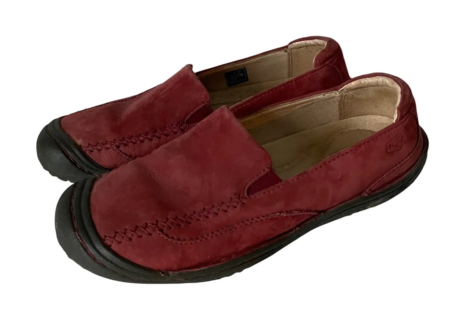 Discover unparalleled comfort and effortless style with these KEEN slip-on loafers. The rich red suede embraces your feet with a soft, supple feel, while the unique stitched detailing adds a touch of artisanal charm. Designed for all-day wear, these shoes offer a relaxed fit and a supportive feel that makes every step a pleasure. Perfect for casual outings, relaxed days at the office, or weekend adventures. Style: Loafer Department: Women Type: Casual Upper Material: Suede Lining Material: Fabric Insole Material: Fabric Pattern: Solid Outsole Material: Rubber Closure: Slip On Shoe Width: Standard Features: Comfort, Cushioned, Slip Resistant Heel Height: Flat (Under 1 in) Accents: Logo Heel Style: Flat Occasion: Casual Keywords: KEEN shoes, red suede, slip on, loafers, comfort shoes, women's footwear, casual shoes, everyday wear, artisanal detail, soft suede, supportive fit, versatile style
