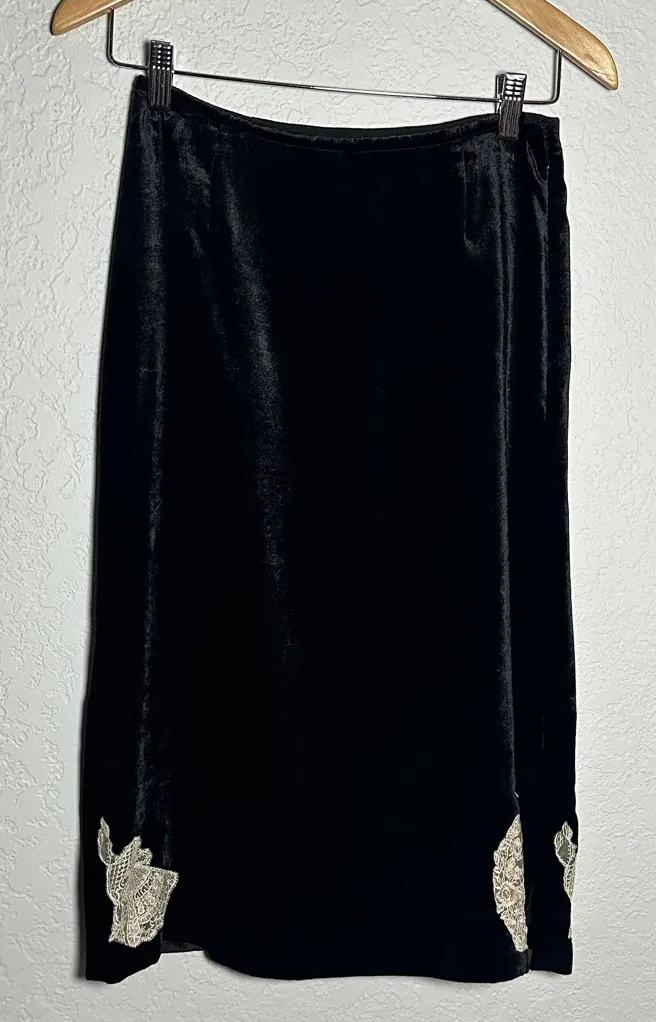Keita Maruyama Black Velvet Skirt with Cream Lace Embroidered Appliqués Midi length Goth Classic Romantic Velvet Japan size 1 which is US size 0 or XS/XXS see measurements Waist flat 13.25” Length 27.5” Side zipper Side slits Excellent condition! I ship fast