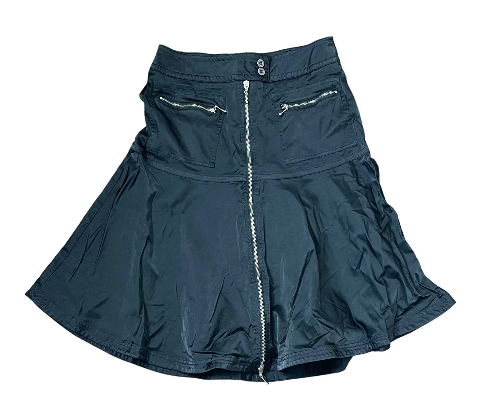 Brand- Kenar Material- 57% Cotton/ 40% Nylon / 3% Spandex Size- 8 Color- Black Measurements: Waist- 27" Length from top to bottom- 23" Condition: Preowned in very good condition. See photos his beautiful blue skirt from Kenar has a nice sheen to the fabric and silver-tone zipper details in the front with pockets. The silhouette is a flattering fit and flare look that is fitted on the top and flares out like a peplum on the bottom. Hardcore punk rock grunge goth girl chic! Thank you for looking. Feel free to check out my other listings for a wide variety of New with tags and used items
