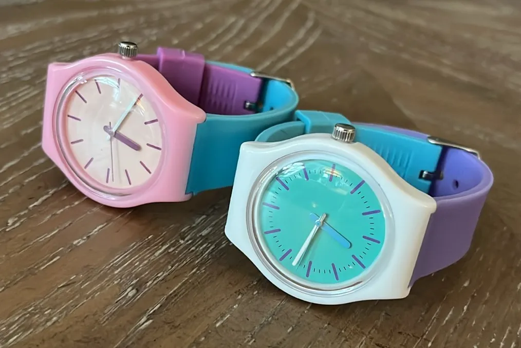Two (2) ladies watches with silicone bands. One has a pink bezel and face with purplish and blue straps. The other has a white bezel, turquoise face and blue and purplish straps. Questions? Leave a comment below!