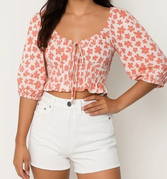 This is a Kendall + Kylie coral floral crop top featuring a ruffle hem and smocked design. Shell 100% Rayon, Lining 100% Polyester Smocked crop top with front tie and puff sleeves Ruffle trim, smocked waist, lightweight fabric Chest: 12" Length: 14" Smocked, Floral, Ruffle, Puff Sleeve, Cottagecore, festival, concert, boho, feminine