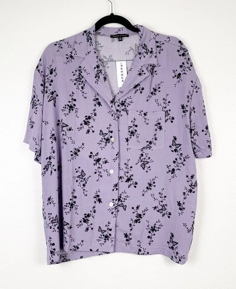 Condition is new with tags. Lightweight button front short sleeve blouse collard purple with butterf... Show more