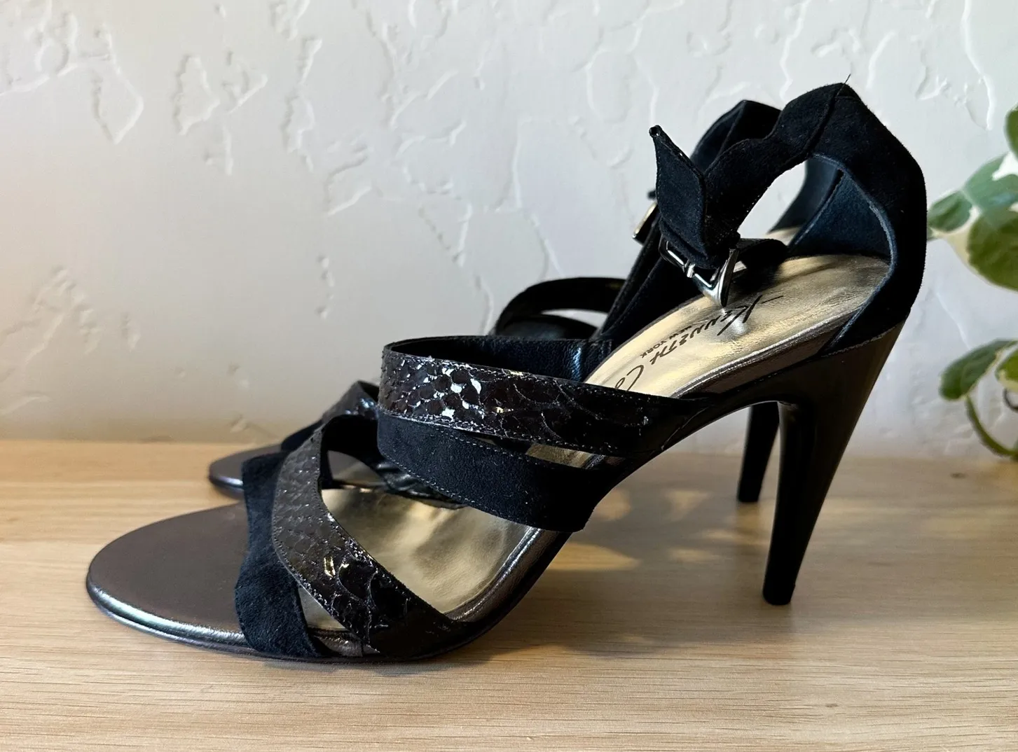 Chic Kenneth Cole strappy heels featuring a mix of soft suede and croc-embossed leather straps with an ankle buckle closure. Sleek pointed stiletto heel with leather sole, made in Italy. Perfect for cocktail parties, weddings, date nights, or elevated office looks.