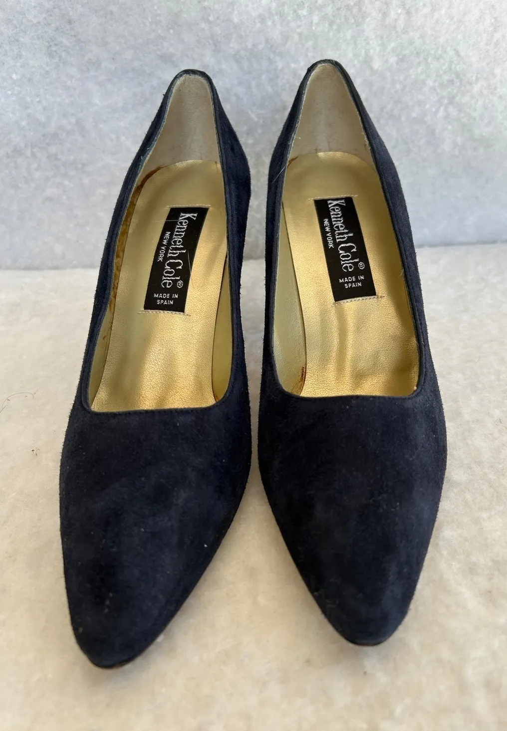 Sculptural elegance comes to life in these vintage Kenneth Cole New York pumps. Envision slipping your feet into the velvety embrace of the black suede, as the pointed toe elongates your silhouette with a touch of refined sophistication. The unique heel adds an unexpected twist, offering both style and comfort for a night out, a special occasion, or adding a touch of class to your work wardrobe. Style: Pump Department: Women Upper Material: Suede Heel Style: Spool Type: Heel Toe Shape: Pointed Toe Heel Height: High (3-3.9 in) Pattern: Solid Closure: Slip On Features: Comfort Keywords: Kenneth Cole, New York, Heels, Pumps, Black Suede, Pointed Toe, Vintage, Classic, Dress Shoes, Career, Special Occasion, Party, Size 8 AA, Designer Shoes