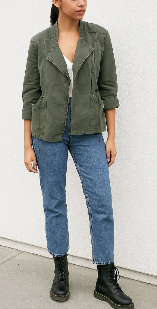 Kenneth Cole New York Moto Utility Style Linen/cotton Jacket Size small Pit to pit zipped 18 inches Length 25 Inches Full front zipper Adjustable sleeves with buttons Double front pockets Drawstring sides Excellent used condition Neutral green color