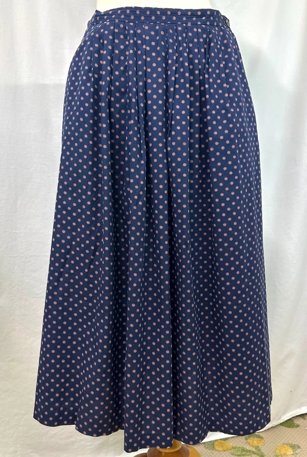 Side button closure, pleated front Feels like silk, material tag is too worn out to tell 80s/90s vintage Has pockets In very good condition, no noticeable flaws MEASUREMENTS: waist 15in flat across, length 30in Type: Skirt Style: Pleated Skirt Length: Long Closure: Button Occasion: Casual, Party/Cocktail, Workwear Keywords: Kenneth Gordon, midi skirt, polka dot, navy blue, pink dots, classic, vintage, workwear, casual, petite, feminine, button front, pleate0dis