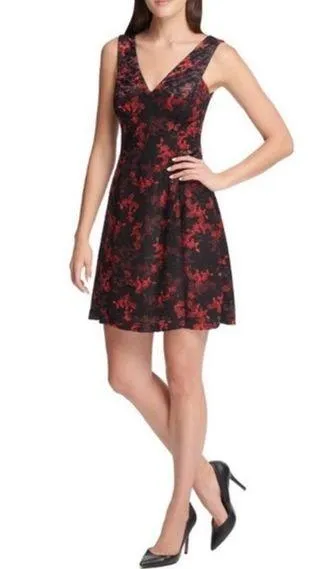 Kensie floral burnout velvet vneck flare dress black and red Size 2 Excellent condition- worn onc... Show more