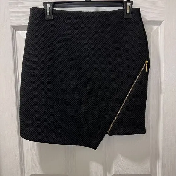 Sophisticated black mini skirt featuring a unique quilted/textured fabric pattern and an eye-catchin... Show more