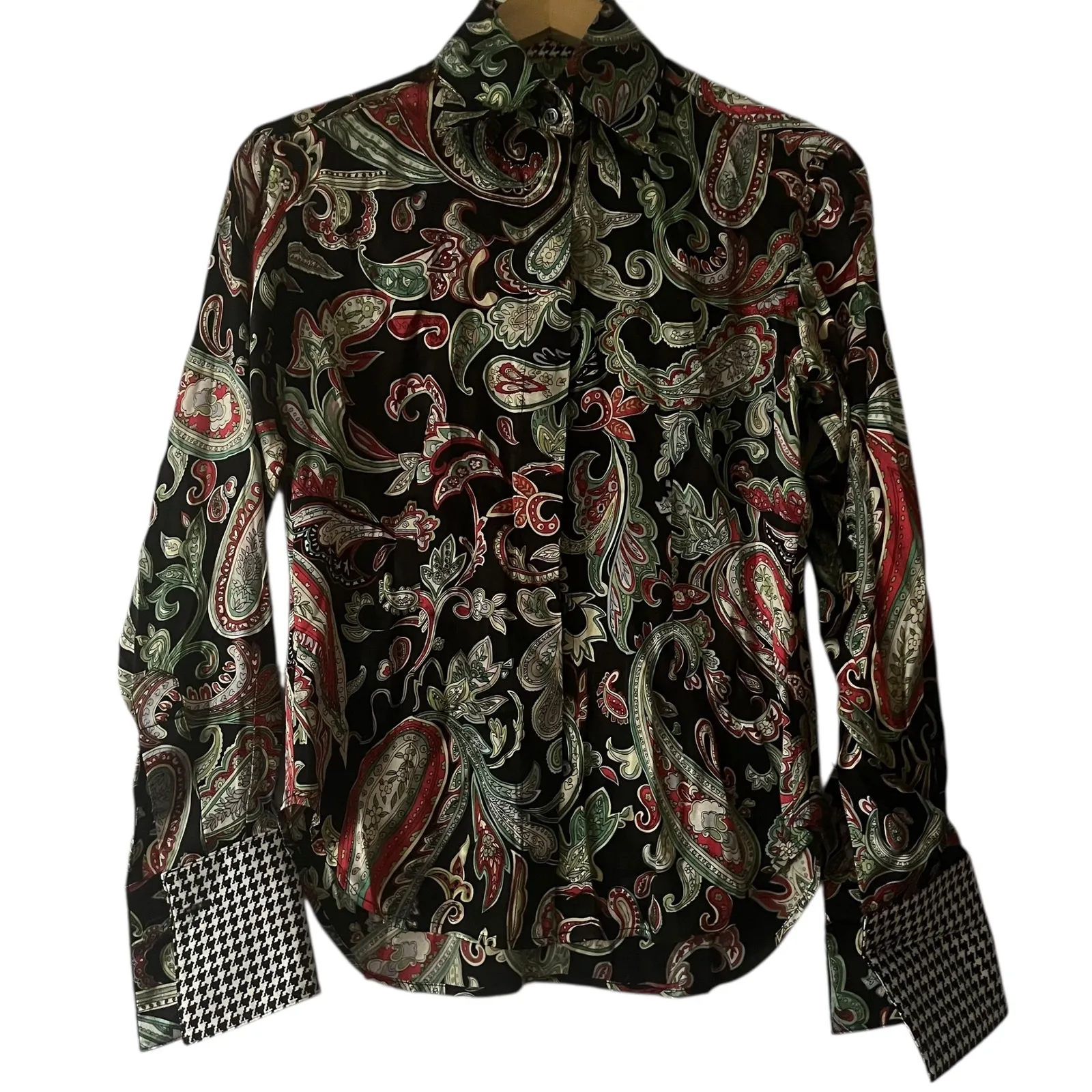 Size 8 Preowned/gently used Ships fast! Ships from a smoke free pet friendly home Keywords: Kent Nielsen shirt, black paisley shirt, women's button up, long sleeve blouse, houndstooth cuffs, designer print shirt, fashionable top, size 8 shirt, elegant office wear, sophisticated evening, chic brunch outfit, vibrant print, contrasting cuffs
